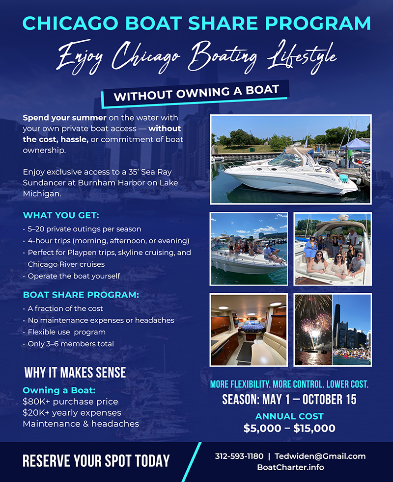 This is a great opportunity for anyone to use a wonderful boat this summer for a fraction of the price of full ownership. The boat is in a slip at Burnham Harbor. The season goes from May through October, sign up now and enjoy the entire season.
